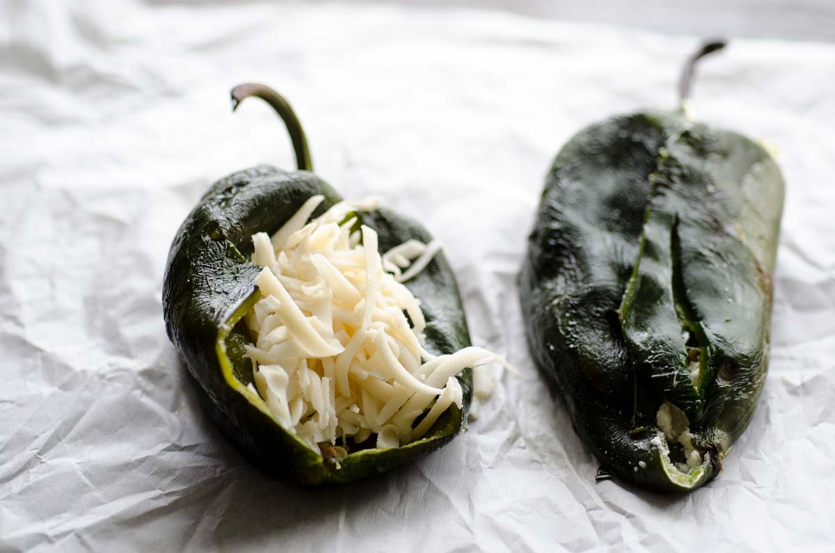 Once the peppers are peeled and deveined you can stuff them! These ones are stuffed with cheese, which is my favorite way, I like to use Oaxaca cheese. You can also stuff them with some shredded chicken, or pork, or finely chopped brisket if you wanted.